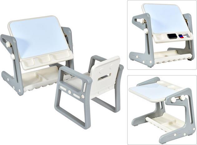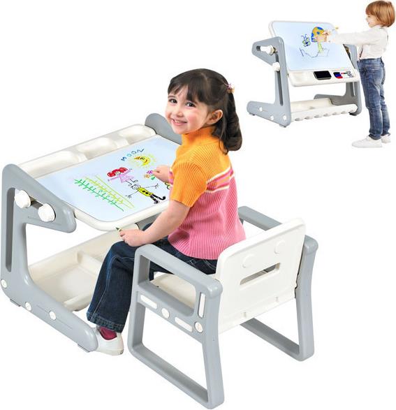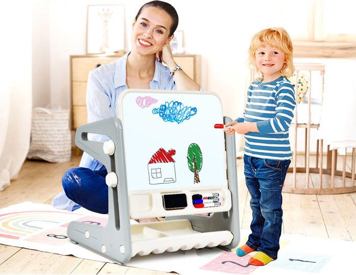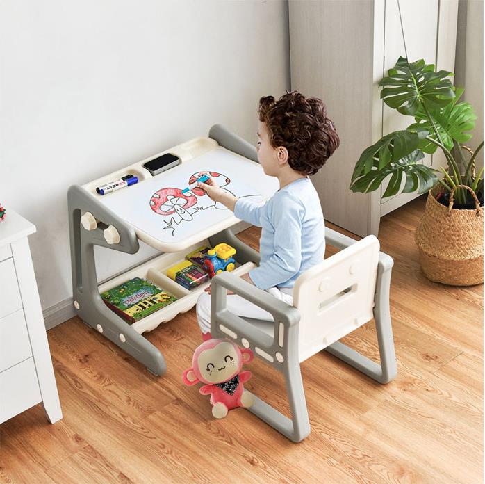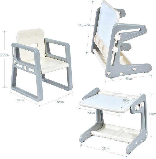 Ο παιδικός πίνακας ζωγραφικής, μπορεί να χρησιμοποιηθεί ως τραπέζι και μπορείτε να προσαρμόσετε τη γωνία για να τον κάνετε σανίδα σχεδίασης. Με την κινητή επιφάνειά του, μπορείτε να προσαρμόσετε ελεύθερα το εύρος γωνίας της επιφάνειας του τραπεζιού από 0 έως 90° όπως απαιτείται. Μπορεί να είναι είτε ένα επίπεδο τραπέζι για μελέτη είτε ένας κάθετος πίνακας σχεδίασης για ζωγραφική. Το τραπέζι ζωγραφικής είναι εξοπλισμένο με πολλές υποδοχές για να παρέχει στο παιδί σας περισσότερο χώρο αποθήκευσης. Υπάρχουν 3 μικρές στην επιφάνεια του τραπεζιού για την αποθήκευση αξεσουάρ ζωγραφικής, όπως οι μαρκαδόροι που περιλαμβάνονται. Οι 2 μεγάλες στο κάτω μέρος μπορούν να αποθηκεύσουν βιβλία ζωγραφικής, μικρά παιχνίδια κ.λπ. Η άνετη καρέκλα με πλάτη μπορεί να στηρίξει αποτελεσματικά την πλάτη και να βοηθήσει τα παιδιά να διατηρήσουν τη σωστή στάση του καθίσματος. Τα αντιολισθητικά μαξιλαράκια στα πόδια προστατεύουν το πάτωμα όταν μετακινείτε το τραπέζι και την καρέκλα. Χάρη στο μικρό του βάρος, μπορείτε εύκολα να μεταφέρετε αυτό το σετ σε οποιαδήποτε τοποθεσία θέλετε. Επιπλέον, μπορείτε εύκολα να το συναρμολογήσετε και να το αποσυναρμολογήσετε σε σύντομο χρονικό διάστημα.