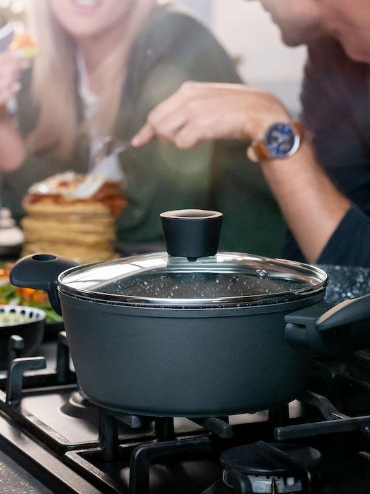 Οι κατσαρόλες της σειράς Magma είναι κατασκευασμένες από πρεσσαριστό αλουμίνιο πάχους 3.0 mm και τριπλή μαρμάρινη αντικολλητική επίστρωση με αντικολλητικές ιδιότητες και ενισχυμένη ανθεκτικότητα στα γδαρσίματα. Διαθέτει γυάλινο πυράντοχο καπάκι που περιβάλλεται από ανοξείδωτο στεφάνι και εργονομικές αντιολισθητικές λαβές από βακελίτη που παραμένουν κρύες κατά το μαγείρεμα.