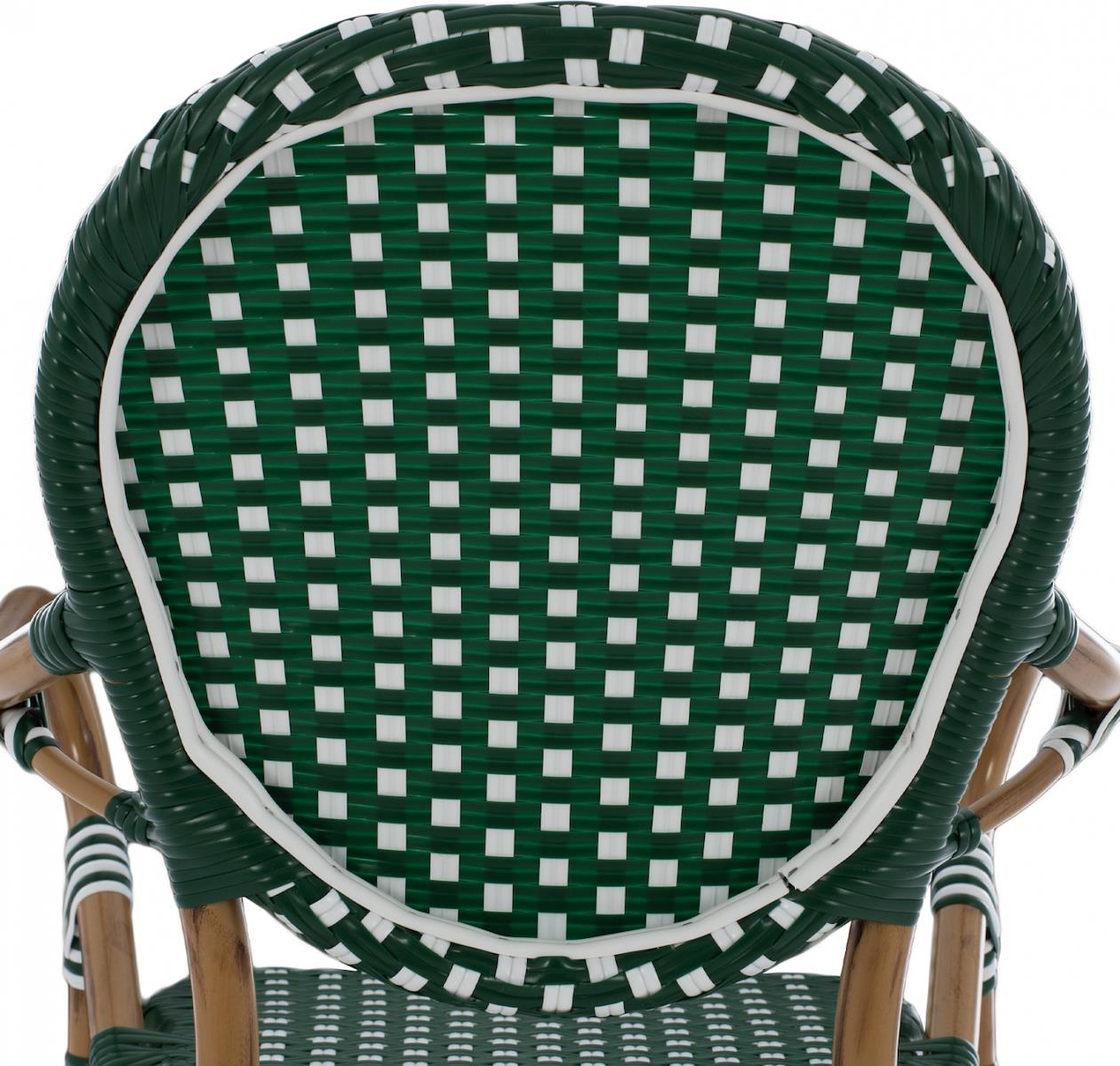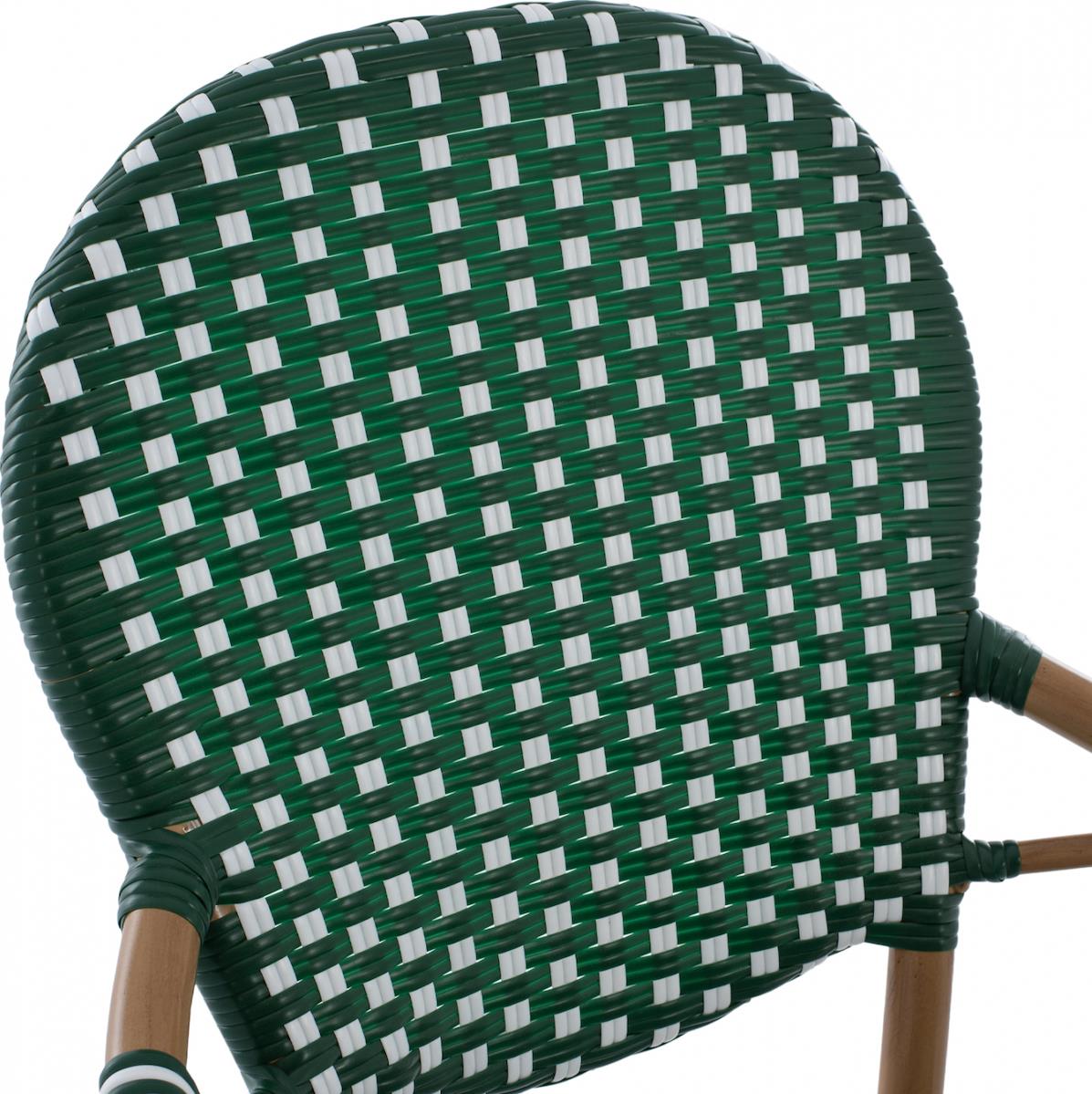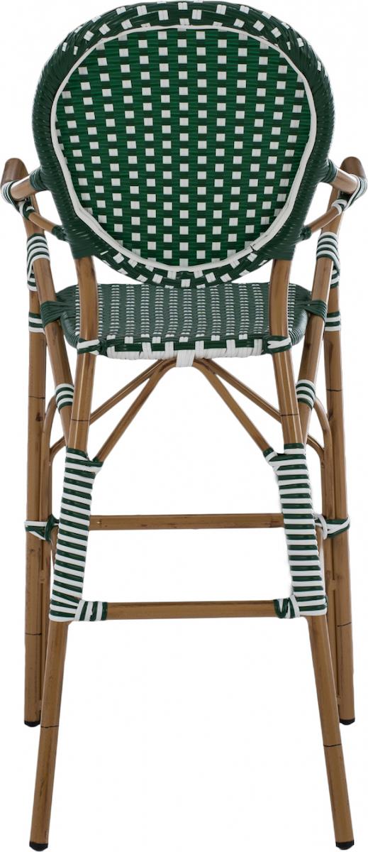 Σκαμπό αλουμινίου Bamboo Look επενδυμένο με wicker σε πλάτη και κάθισμα, σε μοναδική απόχρωση καφέ με επένδυση λευκό με πράσινο.