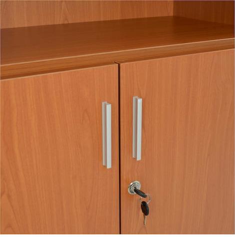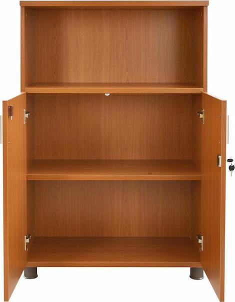 Ντουλάπι γραφείου για επαγγελματική χρήση, κατασκευασμένο από ανθεκτική μελαμίνη σε κερασί απόχρωση με δύο πόρτες, έναν ανοιχτό αποθηκευτικό χώρο, κλειδαριά, και ένα εσωτερικό ράφι, για να αποθηκεύεις έντυπα και τα καθημερινά μικροαντικείμενα του γραφείου σου.