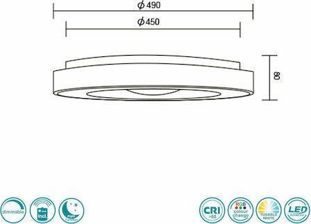 Η πηγή φωτός του φωτιστικού είναι τεχνολογίας SMD LED ισχύος 22W, φωτεινής ροής 2500Lm, με θερμοκρασία χρώματος tunable white (3000K - 6000K), δυνατότητα εναλλαγής χρωμάτων RGB, ασύρματο χειριστήριο για να επιλέξετε θερμοκρασία χρώματος (tunable white) και επίπεδο έντασης φωτισμού (Dimming), νυχτερινή λειτουργία και τέλος αποθηκεύει το τελευταίο σενάριο φωτισμού που επανέρχεται όταν ξανατεθεί σε λειτουργία. Ο δείκτης χρωματικής απόδοσης (Color Rendering Index CRI) είναι μεγαλύτερος από 80 υποδηλώνει καλή απόδοση χρωμάτων.